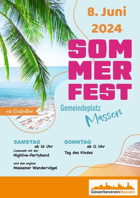 Tauchen Sie ein in eine sommerliche Atmosphäre und feiern Sie mit uns das Sommerfest! Ab 16 Uhr öffnen wir die Tore für einen erlebnisreichen Tag. Genießen Sie Live-Musik mit der Highlive Partyband ab 17 Uhr und den original Massener Wandervögeln ab 21 Uhr. Für das leibliche Wohl ist bestens gesorgt: Freuen Sie sich auf eine Cocktailbar, einen Bierwagen und köstliche Grillgerichte wie Bratwurst und Currywurst. Die Jugendabteilung Fußball der SG Massen überrascht mit leckeren Crêpes.